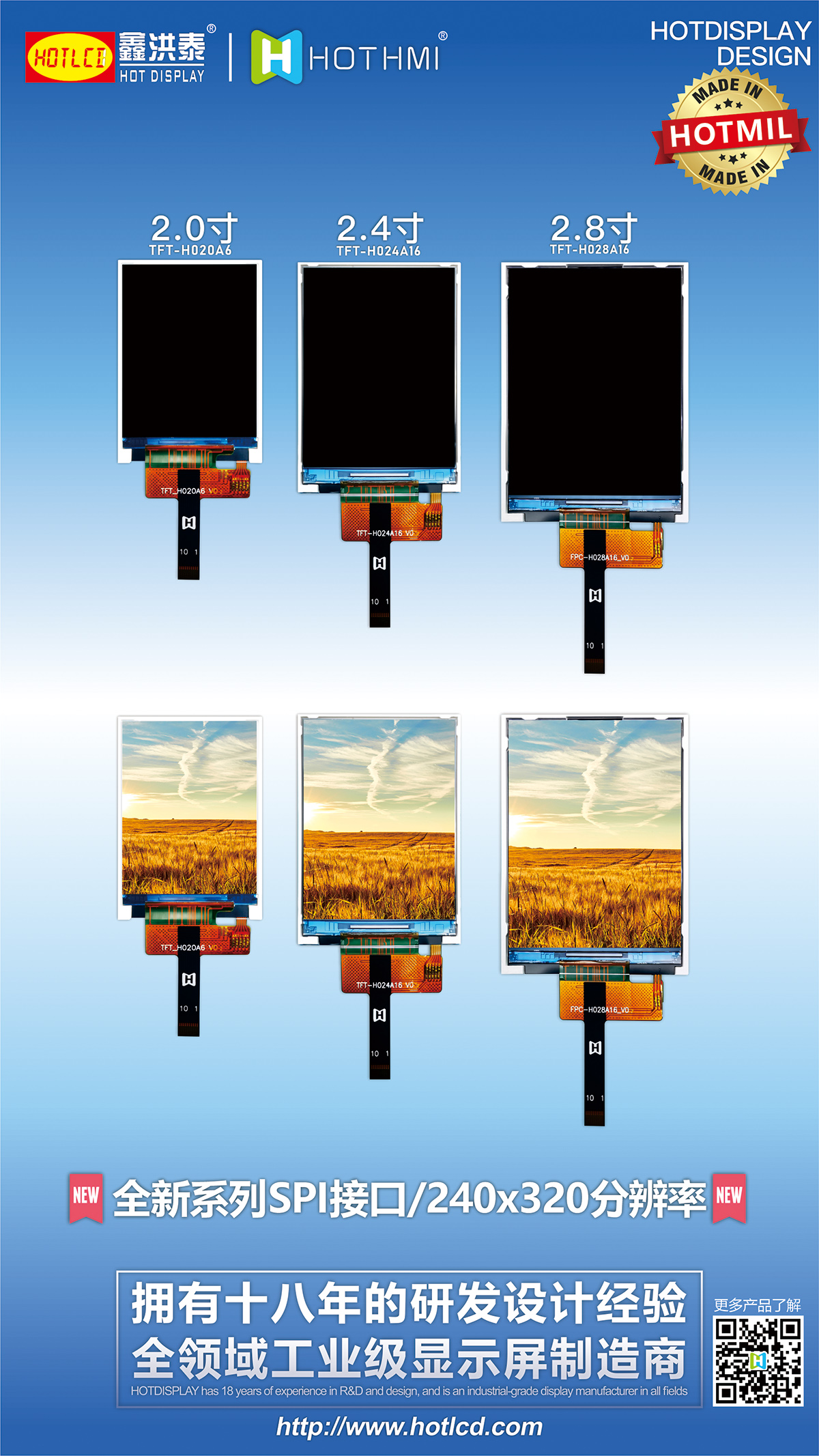 HOTLCD創立22年來,已開發出超過2000標準和非標準液晶顯示屏及模組,廣泛應用于人工智能、5G通訊、無人機、物聯網、車聯網、智能家居、智能穿戴、智慧交通、儀器儀表、醫療設備、工控設備、電力設備、勘探設備、航空航天、軍事裝備等諸多先進領域。
